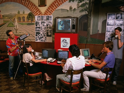 ![]() Electronic Cafe, July-Sept. 1984. Called "One of the most innovative projects of the Los Angeles Olympic Arts Festival," officially commissioned as an Olympic Arts Festival Project by the Museum of Contemporary Art (MOCA), Los Angeles. Electronic Cafe linked MOCA and five ethnically diverse communities of Los Angeles through a state-of-the-art telecommunications computer database and dial-up image bank designed as a cross-cultural, multi-lingual network of "creative conversation." From MOCA downtown, and the real cafes located in the Korean community, Hispanic community, black community and beach communities of Los Angeles, people separated by distance could send and receive slow-scan video images, draw or write together with an electronic writing tablet, print hard-copy pictures with the video printer, enter information or ideas in the computer database and retrieve it with Community Memory(TM) keyword search, and store or retrieve images on a videodisc recorder which held 20,000 images. Electronic Cafe ran six hours a day, six days a week for seven weeks. Pictured: The Electronic Cafe table at Ana Maria's Restaurant in East Los Angeles. HP: What about the communications possibilities of videotapes now that every- body's got a VCR? KG: The great thing about tape rentals is that they're just knocking the side out of broadcast television and cable. It's just knocking them for a loop. GY: Mailing around personal videotapes and the home VCR network is revolutionary, but the real issue is to have an alternative social world that doesn't stop, that is continuous the way television is. Television is a social world, it's there 24 hours a day, it has a history. They're called series, you know. The news develops a history: "You know what happened yesterday, here's the update," and so on. So it's a world. The point is to have this alternative social world that's always there and never stops and is always validating itself as a possible social world. And then along side of that are all these other supplementary "periodic" media. I can go to the store and get a tape just the same as I can go to the store and get Mother Jones or Newsweek. But if it were only these periodic media, this would not constitute an alternative social world of any significant power. So they're complementary. HP: The Electronic Cafe ran for over seven weeks. Why couldn't it have just kept running indefinitely? KG: Nobody wanted it to come down, but we couldn't perpetuate it because it was not cost effective. We put it together with available technology and it wasn't the system to perpetuate. Now we've got a system that's cost effective. SR: One obvious idea that we've thought about is a new electronic museum. It's a way to link people, places and art works in this new environment. GY: Electronic Cafe created this new inversion of the art and life situation. The longer it ran the more it just became life, right? In a sense you could say the less it became art, the more it became life. Or the shorter it ran the more it became art, but the less it would be doing what it ought to really be doing, which is becoming life. KG: Just look at this